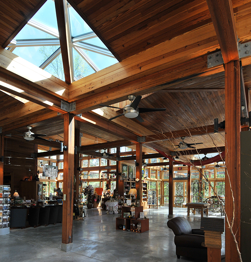 The Bernheim Forest Visitors Center was conceived as a wood structure and a LEED building candidate. Recycled fir and cypress lumber from pickle vats were donated by Hines to make the interior siding and trim. Marvin windows and doors were made from FSC certified lumber. Over 14 species of native lumber were used on the interior wall paneling along with various species of lumber reclaimed from a demolished Jim Beam barrelhouse. This building was the first Platinum LEED building in Kentucky.